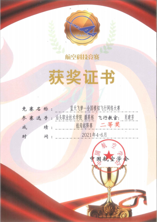 2021年4月至6月,我院计算机系组织学生参加中国航空学会举办的“蓝天飞梦-2021全国模拟飞行网络大赛”。历经连续3个月的多轮排位角逐,最终2020级计算机应用技术1班的苏章佳同学以航母起降赛项总积分全国排名第二的优异成绩获得了一等奖,潘英栋同学获得二等奖。