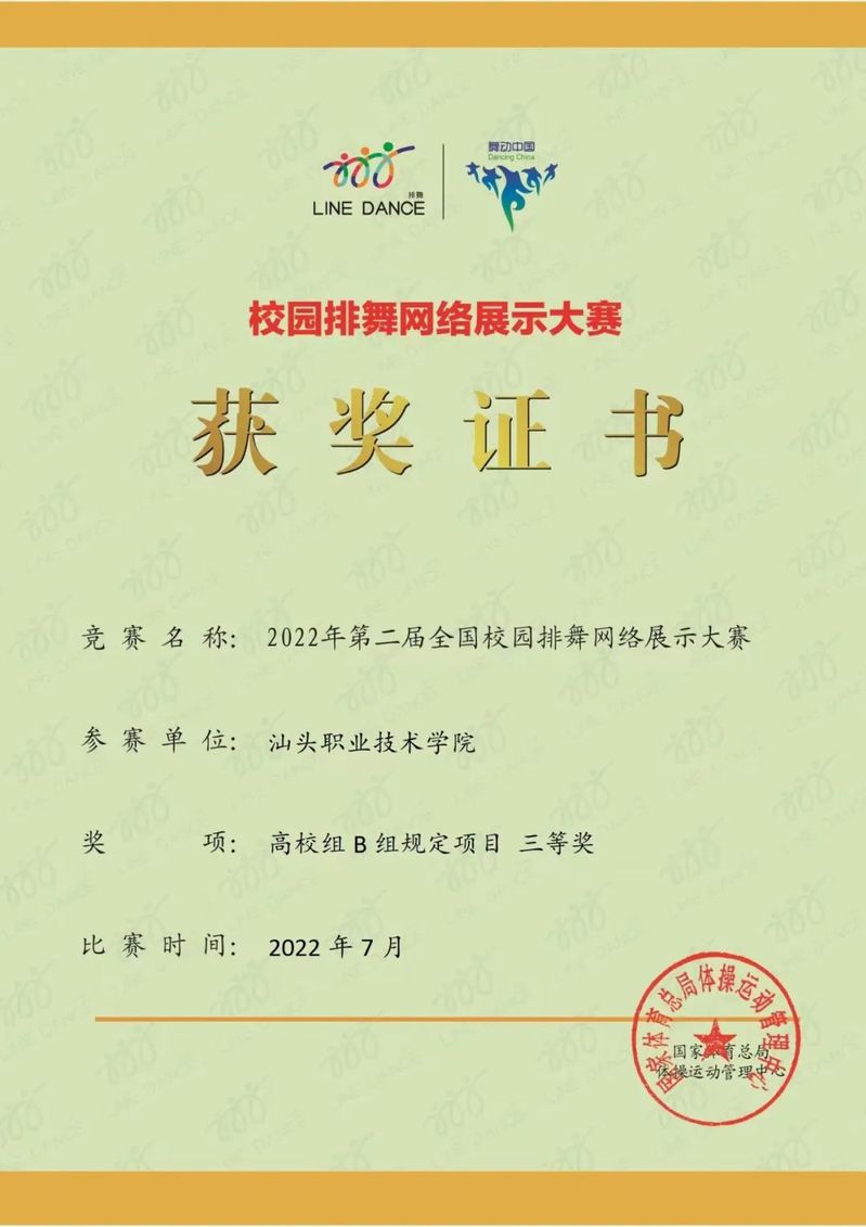 7月1-3日,我院在2022年第二届全国校园排舞网络展示大赛中荣获高校组B组规定项目三等奖与优秀推广奖。此次大赛我院共派出220名运动健儿参加,在艺术体育系体育专业教研室钟昭金老师的精心指导下,运动健儿们在镜头前展示作品《我和我的国》共庆建党101周年,赢得荧幕前观众和评委的喝彩与点赞。