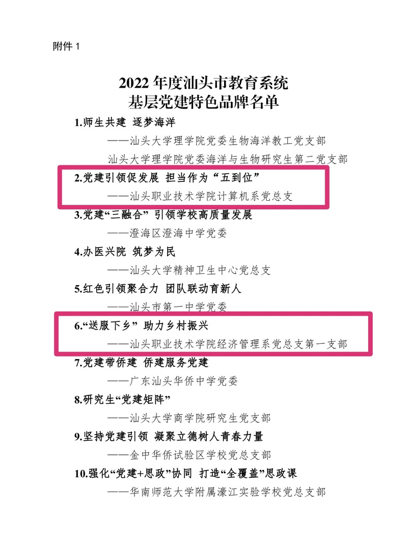 近日,汕头市委教育工委公布“2022年度汕头市教育系统基层党建特色品牌”评选结果,全市教育系统共有10个基层党建品牌入选,我院计算机系党总支、经济管理系党总支第一支部榜上有名。