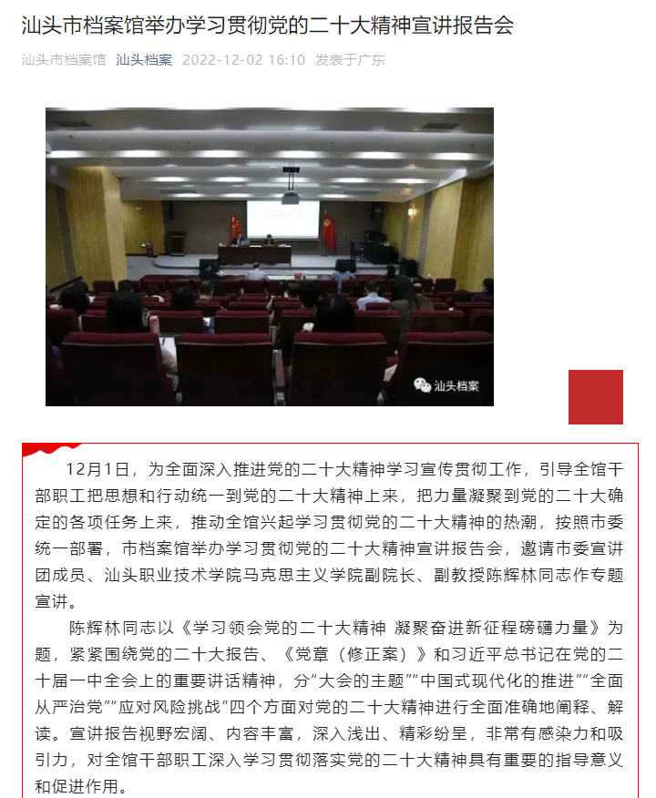 马院林文雄院长、陈辉林副院长作为市委理论宣讲团成员,先后赴濠江区宣传部、濠江区教育局、市档案馆等多个单位开展主题宣讲。两位宣讲团成员以暖心提气的话语、生动鲜活的案例、直观翔实的数据,对党的二十大精神进行了宣讲阐释,并获得好评。
